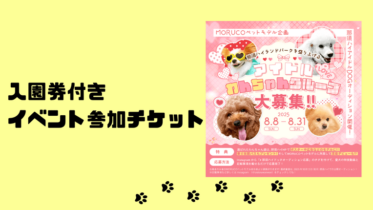 2025年10月13日(月祝)開催「那須ハイアイドルDOGオーディション」の入園券付きイベント参加チケットです。※乗り放題は含まれていません。