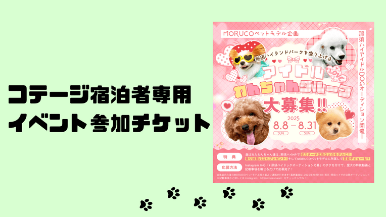 2025年10月13日(月祝)開催「那須ハイアイドルDOGオーディション」の、TOWAピュアコテージご宿泊の方・入園券等をお持ちの方専用オフ会参加チケットです。※入園料および乗り放題は含まれません。※TOWAピュアコテージご宿泊のお客様は、駐車券が無料となります。窓口にて無料認証を行いますので、駐車券と宿泊証明証のご提示をお願いいたします。