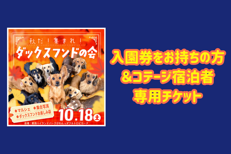 2025年10月18日(土)開催「秋だ!集まれ!ダックスフンドオフ会」の、TOWAピュアコテージご宿泊の方・入園券等をお持ちの方専用オフ会参加チケットです。※入園料および乗り放題は含まれません。※TOWAピュアコテージご宿泊のお客様は、駐車券が無料となります。窓口にて無料認証を行いますので、駐車券と宿泊証明証のご提示をお願いいたします。