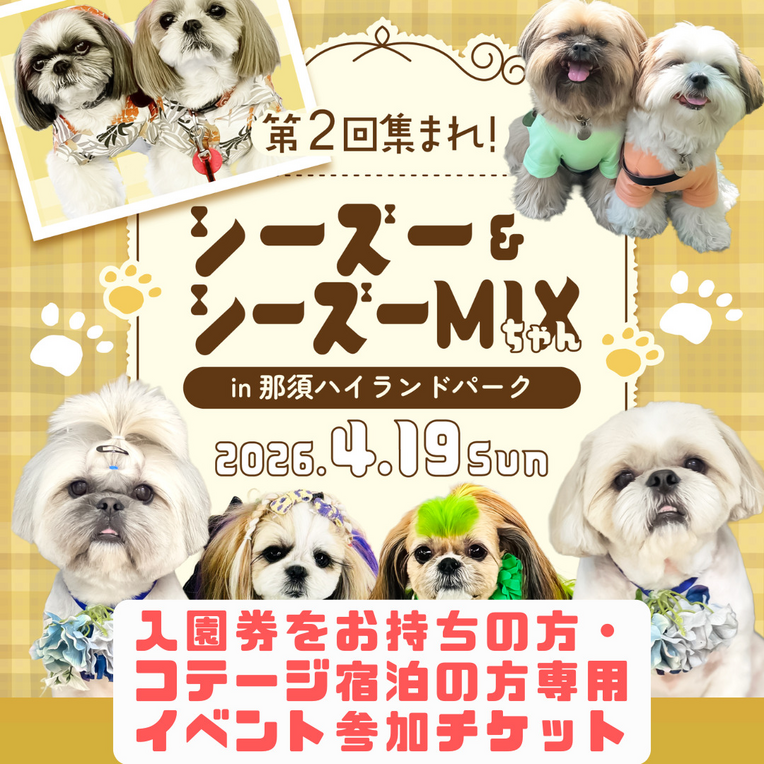 【ID:5086】【集まれ!シーズー&シーズーMIXちゃんin那須ハイランドパーク】4/19 TOWAピュアコテージご宿泊の方・入園券をお持ちの方専用イベント参加チケット